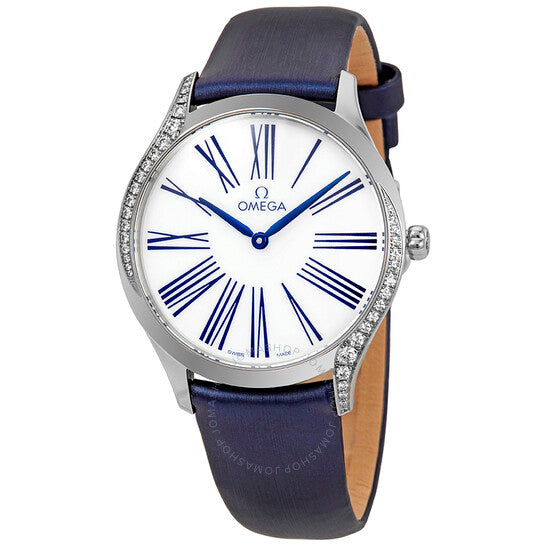 علبة من الفولاذ المقاوم للصدأ مع سوار أزرق من القماش (مغطى بالجلد). إطار ثابت من الفولاذ المقاوم للصدأ مرصع بالألماس. ميناء أبيض بعقارب زرقاء وعلامات ساعات بأرقام رومانية. نوع الميناء: تناظري. حركة كوارتز أوميغا عيار 4061. زجاج ياقوت مقاوم للخدش. تاج قابل للسحب/الدفع. غطاء خلفي صلب. شكل دائري. حجم العلبة: 36 مم. سمكها: 8.85 مم. عرض السوار: 18 مم. مشبك تانغ. مقاومة للماء حتى عمق 30 مترًا / 100 قدم. الوظائف: الساعات، الدقائق. تصميم ساعة فاخرة. علامة الساعة: صناعة سويسرية. ساعة أوميغا دي فيل نسائية مرصعة بالألماس بمينا بيضاء 428.17.36.60.04.001