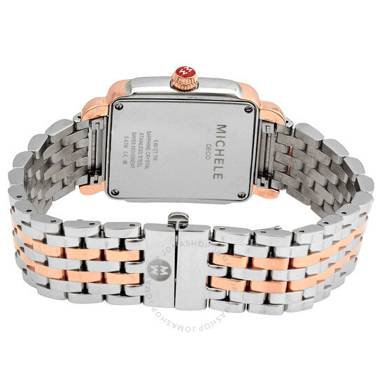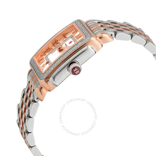 علبة من الفولاذ المقاوم للصدأ بسوار من الفولاذ المقاوم للصدأ ثنائي اللون (فضي وذهب وردي عيار 18 قيراطًا). إطار ثابت من الذهب الوردي مرصع بالألماس. ميناء فضي أبيض مزين بنقشة أشعة الشمس (مرصع بالألماس) مع عقارب هيكلية من الذهب الوردي وعلامات ساعات بأرقام رومانية. نوع الميناء: تناظري. عرض التاريخ عند موضع الساعة 6. حركة كوارتز. زجاج ياقوت مقاوم للخدش. تاج قابل للسحب/الدفع. غطاء خلفي صلب. شكل العلبة مربع. حجم العلبة: 31 مم. عرض السوار: 16 مم. مشبك قابل للطي. مقاومة للماء حتى عمق 50 مترًا / 165 قدمًا. الوظائف: التاريخ، الساعة، الدقيقة، الثانية. معلومات إضافية: إطار مرصع بـ 148 ماسة (0.6000 قيراط). سلسلة ديكو ماديسون المتوسطة. طراز ساعة رسمية. علامة الساعة: صناعة سويسرية. ساعة ميشيل ديكو ماديسون النسائية متوسطة الكوارتز مرصعة بالألماس MWW06G000015.