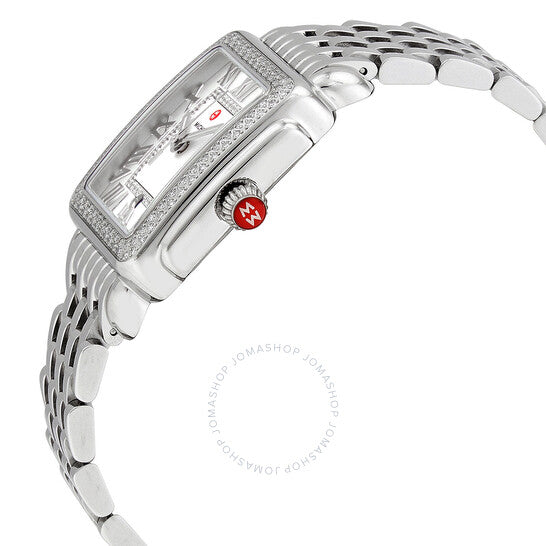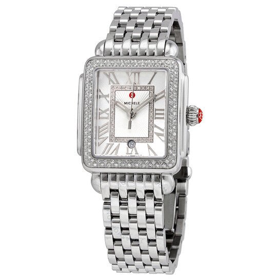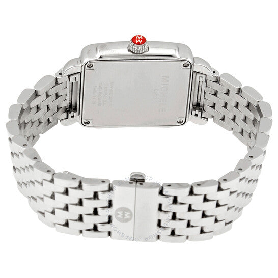 علبة من الفولاذ المقاوم للصدأ مع سوار من الفولاذ المقاوم للصدأ. إطار ثابت من الفولاذ المقاوم للصدأ مرصع بالألماس. ميناء فضي أبيض (مرصع بالألماس) بعقارب فضية اللون وعلامات ساعات بأرقام رومانية. نوع الميناء: تناظري. عرض التاريخ عند موضع الساعة السادسة. حركة كوارتز. زجاج ياقوت مقاوم للخدش. تاج قابل للسحب/الدفع. غطاء خلفي صلب. شكل العلبة مربع. أبعاد العلبة: ٢٩ مم × ٣١ مم. عرض السوار: ١٦ مم. مشبك فراشة قابل للطي. مقاومة للماء حتى عمق ٥٠ مترًا / ١٦٥ قدمًا. الوظائف: التاريخ، الساعة، الدقيقة، الثانية. معلومات إضافية: علبة مرصعة بـ ١٤٨ ماسة (٠.٦ قيراط). سلسلة ديكو ماديسون المتوسطة. طراز ساعة رسمية. ساعة ميشيل ديكو ماديسون النسائية متوسطة الكوارتز MWW06G000001.