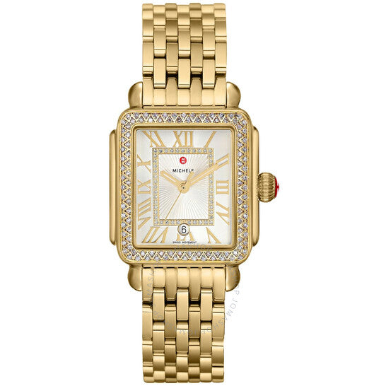 علبة وسوار من الفولاذ المقاوم للصدأ مطليان بالذهب عيار ١٨ قيراطًا. إطار ثابت مطلي بالذهب عيار ١٨ قيراطًا مرصع بالألماس. ميناء فضي أبيض (مرصع بالألماس) بعقارب ذهبية مضيئة وعلامات ساعات بأرقام رومانية. نوع الميناء: تناظري. عقارب مضيئة. عرض التاريخ عند موضع الساعة ٦. حركة كوارتز. زجاج ياقوت مقاوم للخدش. تاج قابل للسحب/الدفع. غطاء خلفي صلب. شكل العلبة مربع. حجم العلبة: ٢٩ مم. عرض السوار: ١٦ مم. مشبك قابل للطي. مقاومة للماء حتى عمق ٥٠ مترًا / ١٦٥ قدمًا. الوظائف: كرونوغراف، تاريخ، ساعة، دقيقة، ثانية. معلومات إضافية: ساعة مرصعة بـ ١٤٨ ماسة (٠.٦٠٠٠ قيراط). سلسلة ديكو ماديسون. طراز ساعة رسمية. علامة الساعة: صناعة سويسرية. ساعة ميشيل ديكو ماديسون كوارتز نسائية مرصعة بالألماس MWW06G000003.