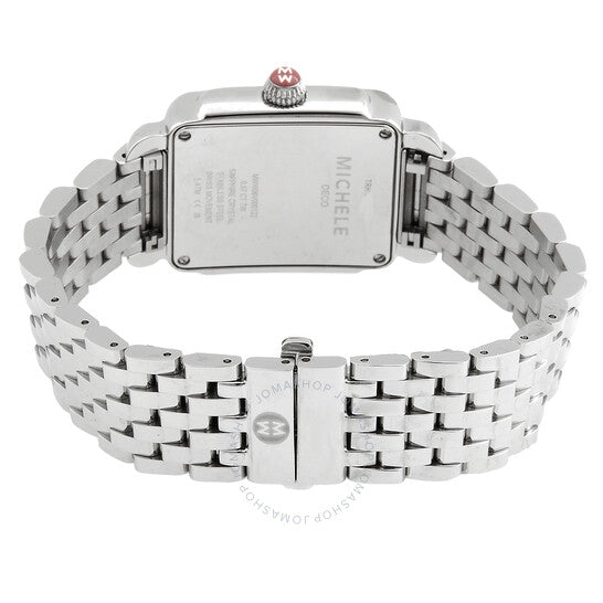 علبة وسوار من الفولاذ المقاوم للصدأ فضي اللون. إطار ثابت فضي اللون مرصع بالألماس من الفولاذ المقاوم للصدأ. ميناء من عرق اللؤلؤ مع عقارب فضية اللون وعلامات ساعات من الألماس. علامات دقائق حول الحافة الخارجية. نوع الميناء: تناظري. عقارب وعلامات مضيئة. حركة كوارتز. زجاج ياقوت مقاوم للخدش. علبة مستطيلة الشكل، مقاسها: ٢٩ مم. مشبك قابل للطي مع مفتاح أمان. الوظائف: الساعات، الدقائق، الثواني. سلسلة ديكو ميد. تصميم ساعة كاجوال. علامة الساعة: صناعة سويسرية. ساعة ميشيل ديكو ميد كوارتز نسائية مرصعة بالألماس MWW06V000122.