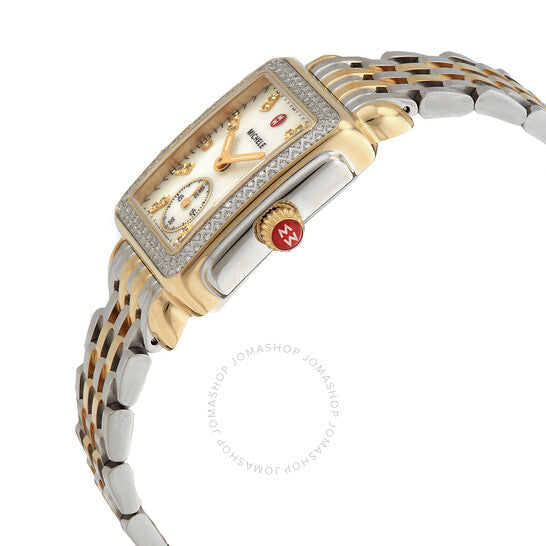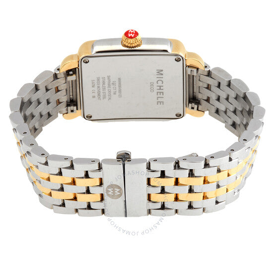 ساعة ديكو ميد ثنائية اللون، إطار من الألماس، ميناء من عرق اللؤلؤ، سوار من لونين. هيكل من الفولاذ المقاوم للصدأ فضي اللون، وسوار من الفولاذ المقاوم للصدأ ثنائي اللون (فضي وذهبي أصفر). إطار ثابت من الذهب الأصفر، مرصع بالألماس. ميناء من عرق اللؤلؤ، مع عقارب وعلامات ساعات من الألماس بلون ذهبي أصفر. علامات دقائق حول الحافة الخارجية. نوع الميناء: تناظري. عقارب وعلامات مضيئة. آلية حركة كوارتز. زجاج ياقوت مقاوم للخدش. هيكل مستطيل الشكل، مقاسه ٢٩ مم. مشبك قابل للطي مع مفتاح أمان. الوظائف: الساعات، الدقائق، الثواني. سلسلة ديكو ميد. تصميم كاجوال. علامة الساعة: صناعة سويسرية. ساعة ميشيل ديكو ميد كوارتز نسائية مرصعة بالألماس، طراز MWW06V000123.