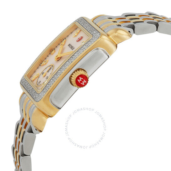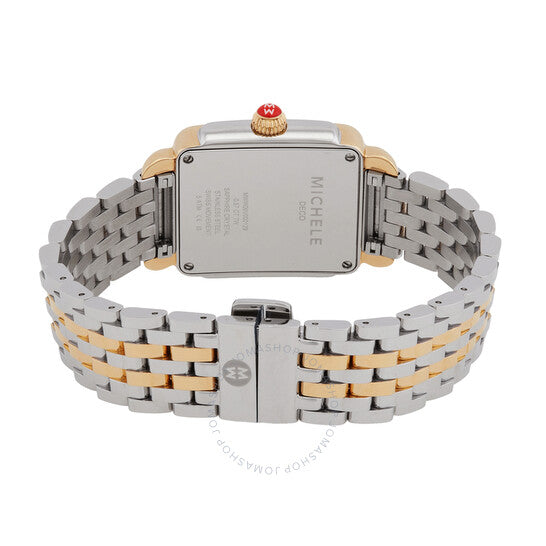 علبة من الفولاذ المقاوم للصدأ فضية اللون مع سوار من الفولاذ المقاوم للصدأ ثنائي اللون (فضي وذهبي أصفر). إطار ثابت من الفولاذ المقاوم للصدأ ذهبي أصفر. ميناء من عرق اللؤلؤ مع عقارب ذهبية صفراء وعلامات ساعات من الألماس. علامات دقائق حول الحافة الخارجية. نوع الميناء: تناظري. عقارب وعلامات مضيئة. حركة كوارتز. زجاج ياقوت مقاوم للخدش. علبة مستطيلة الشكل، مقاسها: ٢٩ مم. قابلة للطي مع مشبك بزر ضغط. مقاومة للماء حتى عمق ٥٠ مترًا / ١٦٥ قدمًا. الوظائف: الساعات، الدقائق، الثواني. سلسلة ديكو ميد. تصميم كاجوال. علامة الساعة: صناعة سويسرية. ساعة ميشيل ديكو ميد كوارتز نسائية مرصعة بالألماس MWW06V000129.