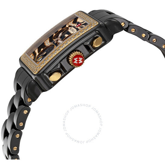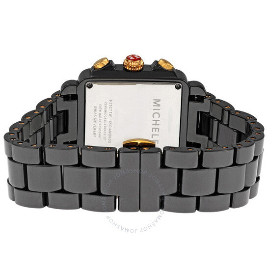 علبة من السيراميك الأسود مع سوار من السيراميك الأسود. إطار ذهبي ثابت مرصع بالألماس. ميناء مطلي بالمينا مرصع بالألماس بنقشة جلد الفهد، مع عقارب ذهبية اللون. عقارب مضيئة. يظهر عرض التاريخ عند موضع الساعة السادسة. كرونوغراف - ثلاثة أقراص فرعية تعرض: 60 ثانية، 30 دقيقة، وعُشر الثانية. حركة كوارتز سويسرية. زجاج معدني مقاوم للخدش. غطاء خلفي صلب. أبعاد العلبة: 33 مم × 46 مم. مشبك قابل للطي. مقاومة للماء حتى عمق 50 مترًا / 165 قدمًا. ساعة ميشيل ديكو سفاري النسائية من السيراميك الأسود بنقشة جلد الفهد، طراز MWW06F000012.