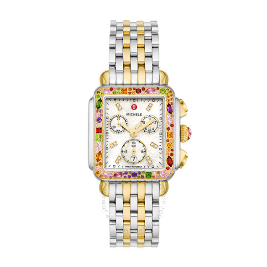 علبة من الفولاذ المقاوم للصدأ فضية اللون مع سوار من الفولاذ المقاوم للصدأ ثنائي اللون (فضي وذهبي أصفر). إطار ثابت من الفولاذ المقاوم للصدأ ذهبي أصفر. ميناء من عرق اللؤلؤ مع عقارب ذهبية صفراء وعلامات ساعات من الألماس. علامات دقائق حول الحافة الخارجية. نوع الميناء: تناظري. عرض التاريخ عند موضع الساعة السادسة. حركة كوارتز. شكل العلبة مستطيل، مقاسها 33 مم. مشبك قابل للطي مع قفل أمان. الوظائف: كرونوغراف، تاريخ، ساعات، دقائق، ثوانٍ. سلسلة ديكو سواريه. تصميم كاجوال. علامة الساعة: صناعة سويسرية. ساعة ميشيل ديكو سواريه كرونوغراف كوارتز مرصعة بالألماس للسيدات MWW06A000801.