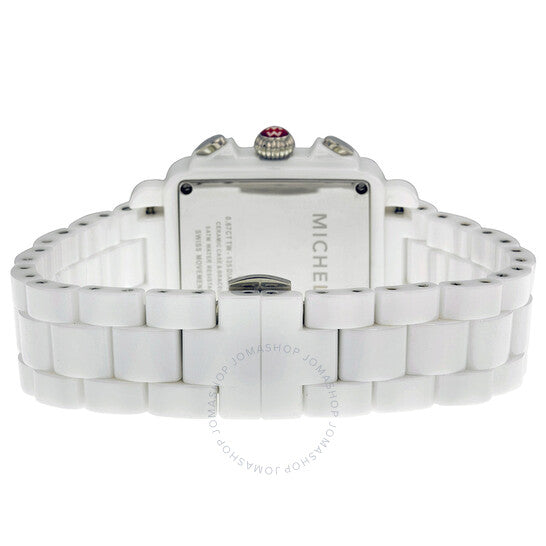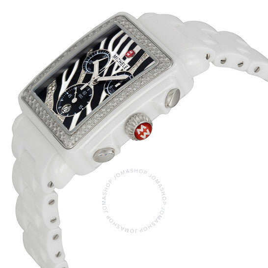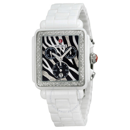 علبة من السيراميك الأبيض مع سوار من السيراميك الأبيض. إطار ثابت من الفولاذ المقاوم للصدأ مرصع بـ 100 ماسة. ميناء أسود بنقشة حمار وحشي، مرصع بالماس وعقارب فضية اللون. لا توجد علامات للساعات. نافذة عرض التاريخ عند موضع الساعة السادسة. كرونوغراف - ثلاثة أقراص فرعية تعرض: 60 ثانية، 30 دقيقة، وعُشر الثانية. آلية حركة كوارتز. زجاج من الياقوت المقاوم للخدش. تاج مُخدّد من الفولاذ المقاوم للصدأ. غطاء خلفي صلب يُغلق بالبراغي. قطر العلبة: 33 مم. مشبك قابل للطي. مقاومة للماء حتى عمق 50 مترًا / 165 قدمًا. الوظائف: كرونوغراف، تاريخ، ساعة، دقيقة، ثانية. ساعة ميشيل ديكو النسائية من السيراميك الأبيض بمينا حمار وحشي MWW06F000010.