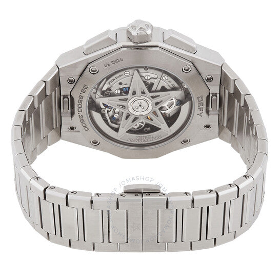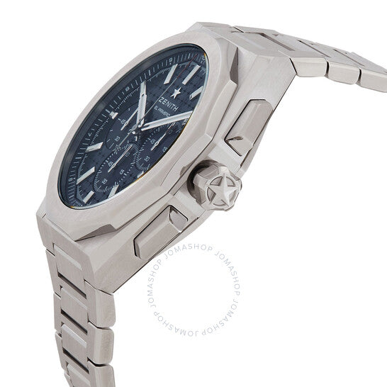 علبة وسوار من الفولاذ المقاوم للصدأ فضي اللون. إطار ثابت من الفولاذ المقاوم للصدأ فضي اللون. ميناء أزرق مع عقارب وعلامات ساعات فضية اللون. مقياس دقائق حول الحافة الداخلية. نوع الميناء: تناظري. عقارب وعلامات مضيئة. عرض التاريخ بين موضعي الساعة 4 و5. كرونوغراف - ثلاثة أقراص فرعية تعرض: 60 ثانية، 60 دقيقة، و1/10 من الثانية. حركة أوتوماتيكية Zenith Calibre El Primero 3600، تحتوي على 35 جوهرة، مكونة من 311 جزءًا، تنبض بمعدل 36000 ذبذبة في الساعة، ولديها احتياطي طاقة لمدة 60 ساعة تقريبًا. زجاج ياقوت مقاوم للخدش. شكل العلبة ثماني الأضلاع، مقاسها: 42 مم. مشبك قابل للطي بزر ضغط. مقاومة للماء حتى عمق 100 متر / 330 قدمًا. الوظائف: كرونوغراف، تاريخ، ساعة، دقيقة، ثانية. سلسلة Defy. طراز ساعة رياضية. ملصق الساعة: صناعة سويسرية. ساعة زينيث ديفاي كرونوغراف أوتوماتيكية للرجال بمينا أزرق 03.9500.3600/51.I001.