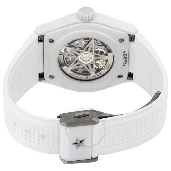 علبة من السيراميك الأبيض مع سوار مطاطي أبيض. إطار ثابت من السيراميك الأبيض. ميناء هيكلي بعقارب فضية مضيئة ومؤشرات ساعات. مؤشرات دقائق حول الحافة الخارجية. نوع الميناء: تناظري. عقارب ومؤشرات مضيئة. عرض التاريخ عند موضع الساعة السادسة. حركة أوتوماتيكية من عيار زينيث إيليت 670، مستوحاة من زينيث إيليت 680، تحتوي على 27 جوهرة، مكونة من 144 جزءًا، تنبض بمعدل 28800 ذبذبة في الساعة، ولديها احتياطي طاقة يصل إلى حوالي 50 ساعة. زجاج ياقوتي مقاوم للخدش. تاج قابل للسحب/الدفع. غطاء خلفي شفاف. شكل دائري. حجم العلبة: 41 مم. سمكها: 9.45 مم. مشبك قابل للطي. مقاومة للماء حتى عمق 100 متر / 330 قدمًا. الوظائف: التاريخ، الساعة، الدقائق، الثواني. سلسلة ديفاي كلاسيك. تصميم ساعة فاخر. علامة الساعة: صناعة سويسرية. ساعة زينيث ديفاي كلاسيك الأوتوماتيكية للرجال 49.9002.670/01.R792.