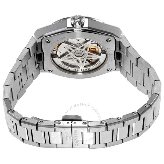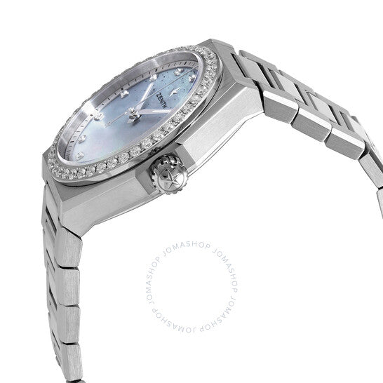 علبة من الفولاذ المقاوم للصدأ مع سوار من الفولاذ المقاوم للصدأ. إطار ثابت من الفولاذ المقاوم للصدأ مرصع بالألماس. ميناء متدرج من عرق اللؤلؤ مع عقارب فضية مضيئة وعلامات ساعات من الألماس. علامات دقائق حول الحافة الخارجية. نوع الميناء: تناظري. عقارب مضيئة. عرض التاريخ عند موضع الساعة 3. حركة أوتوماتيكية من زينيث كاليبر إيليت مع احتياطي طاقة يصل إلى 50 ساعة. زجاج ياقوت مقاوم للخدش. تاج قابل للسحب/الدفع. غطاء خلفي صلب. شكل دائري. حجم العلبة: 36 مم. سمكها: 10.35 مم. مشبك قابل للطي بزر ضغط. مقاومة للماء حتى عمق 100 متر / 330 قدمًا. الوظائف: التاريخ، الساعة، الدقائق، الثواني. سلسلة ديفاي ميدنايت. تصميم ساعة فاخرة. علامة الساعة: صناعة سويسرية. ساعة زينيث ديفاي ميدنايت أوتوماتيكية نسائية مرصعة بالألماس 16.9200.670/03.MI001.