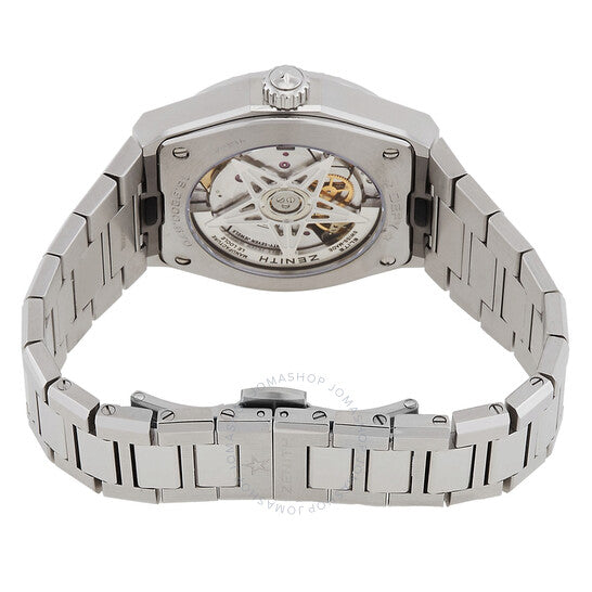 علبة وسوار من الفولاذ المقاوم للصدأ بلون فضي. إطار ثابت بلون فضي مرصع بالألماس. ميناء متدرج من الأزرق إلى الأخضر مع نقش غيوشيه، مع عقارب فضية اللون وعلامات ساعات مرصعة بالألماس. نوع الميناء: تناظري. عقارب مضيئة. نافذة عرض التاريخ عند موضع الساعة 3. حركة أوتوماتيكية من طراز Zenith Calibre Elite 670 SK، مستوحاة من Zenith Elite 670، تحتوي على 27 جوهرة، مكونة من 187 جزءًا، تنبض بمعدل 28800 ذبذبة في الساعة، وتتمتع باحتياطي طاقة يصل إلى حوالي 50 ساعة. زجاج ياقوت مقاوم للخدش. تاج قابل للسحب/الدفع. غطاء خلفي شفاف. شكل العلبة دائري، مقاسها 36 مم. مشبك قابل للطي مع مفتاح أمان. مقاومة للماء حتى عمق 100 متر / 330 قدمًا. الوظائف: التاريخ، الساعة، الدقيقة، الثانية. سلسلة Defy Midnight. طراز ساعة رسمية. علامة الساعة: صناعة سويسرية. ساعة زينيث ديفاي ميدنايت أوتوماتيكية مرصعة بالألماس للسيدات 16.9200.670/34.MI001.