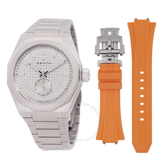 علبة وسوار من الفولاذ المقاوم للصدأ فضي اللون. إطار ثابت من الفولاذ المقاوم للصدأ فضي اللون. ميناء متدرج بنقش سماء مرصعة بالنجوم، مع عقارب فضية اللون وعلامات ساعات. علامات دقائق حول الحافة الخارجية. نوع الميناء: تناظري. عرض التاريخ عند موضع الساعة السادسة. حركة أوتوماتيكية من زينيث كاليبر إل بريميرو 3620 مع احتياطي طاقة لمدة 60 ساعة. زجاج ياقوت مقاوم للخدش. تاج لولبي. غطاء خلفي شفاف. هيكل مثمن الشكل، مقاسه: 41 مم. مقاومة للماء حتى عمق 100 متر / 330 قدمًا. الوظائف: التاريخ، الساعات، الدقائق، عُشر الثانية. سلسلة ديفاي سكاي لاين. تصميم ساعة فاخرة. علامة الساعة: صناعة سويسرية. ساعة زينيث ديفاي سكاي لاين أوتوماتيكية للرجال 06.9300.3620/06.I001.