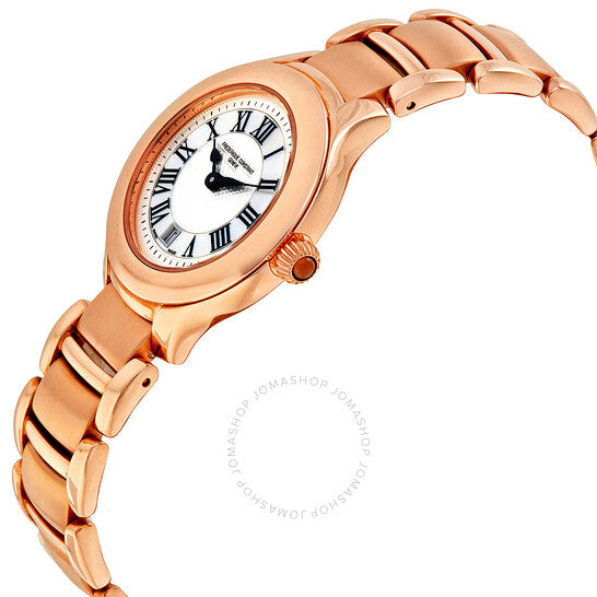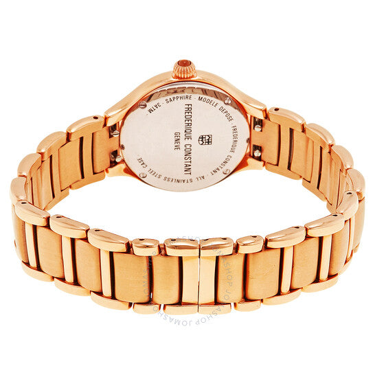 علبة وسوار من الفولاذ المقاوم للصدأ مطليان بالذهب الوردي بتقنية PVD. إطار ثابت من الفولاذ المقاوم للصدأ مطلي بالذهب الوردي بتقنية PVD. ميناء فضي من عرق اللؤلؤ مع عقارب سوداء وعلامات ساعات بأرقام رومانية. علامات دقائق حول الحافة الخارجية. نوع الميناء: تناظري. عرض التاريخ عند موضع الساعة السادسة. حركة كوارتز من عيار فريدريك كونستانت FC-220. زجاج ياقوت مقاوم للخدش. تاج قابل للسحب/الدفع. غطاء خلفي صلب. حجم العلبة: 31 مم. شكل دائري. مشبك مخفي. مقاومة للماء حتى عمق 30 مترًا / 100 قدم. الوظائف: التاريخ، الساعة، الدقائق. طراز ساعة فاخرة. علامة الساعة: صناعة سويسرية. إصدارات متنوعة: FC 220M2ER4B، FC.220M2ER4B، FC220M2ER4B. ساعة فريدريك كونستانت ديلايت النسائية بمينا عرق اللؤلؤ FC-220M2ER4B.