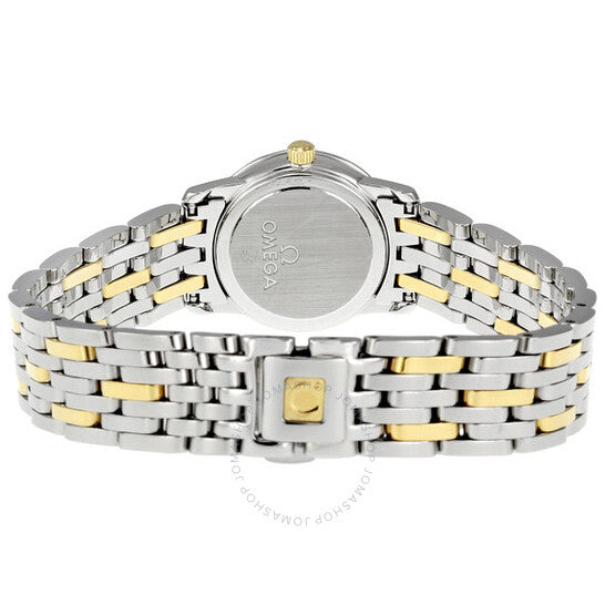 علبة من الفولاذ المقاوم للصدأ مع سوار ثنائي اللون (فولاذ مقاوم للصدأ وذهب عيار 18 قيراطًا). إطار ثابت ثنائي اللون (فولاذ مقاوم للصدأ وذهب عيار 18 قيراطًا). ميناء بلون الشمبانيا مع عقارب ذهبية اللون و16 علامة ساعات مرصعة بالألماس. نوع الميناء: تناظري. حركة كوارتز. العيار: محرك 1456. كريستال ياقوت مقاوم للخدش. تاج ضغط/سحب. غطاء خلفي صلب. قطر العلبة: 22 مم. سمكها: 6 مم. شكلها دائري. عرض السوار: 6 مم. مشبك قابل للطي بزر ضغط. مقاومة للماء حتى عمق 30 مترًا/100 قدم. الوظائف: الساعات، الدقائق. تصميم ساعة فاخرة. علامة الساعة: صناعة سويسرية. ساعة أوميغا ديفيل بريستيج دايموند نسائية 4370.16.
