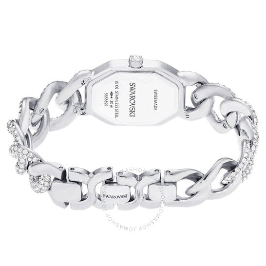 علبة من الفولاذ المقاوم للصدأ فضية اللون مع سوار فضي اللون مرصع بالكريستال. إطار ثابت فضي اللون مرصع بالكريستال. ميناء فضي اللون مع عقارب ومؤشرات ساعات فضية اللون. شعار سواروفسكي على شكل بجعة عند موضع الساعة ١٢. نوع الميناء: تناظري. حركة كوارتز. كريستال معدني مقاوم للخدش. تاج قابل للسحب/الدفع. غطاء خلفي صلب. شكل العلبة ثماني الأضلاع، مقاسها: ٤٤ × ٢٠ مم. مشبك قابل للطي. مقاومة للماء حتى عمق ٣٠ مترًا / ١٠٠ قدم. الوظائف: الساعات، الدقائق. سلسلة دكسترا تشاين. طراز ساعة رسمية. علامة الساعة: صناعة سويسرية. ساعة دكسترا تشاين كوارتز كريستال سواروفسكي بمينا فضي رقم ٥٦٦٨٨٩٩.