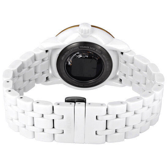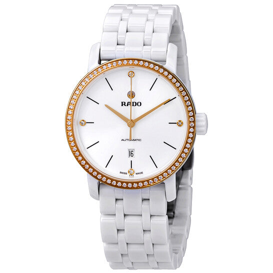 علبة من السيراميك الأبيض عالي التقنية مع سوار من السيراميك الأبيض عالي التقنية. إطار ثابت من الذهب الأصفر عيار 18 قيراطًا مرصع بالألماس. ميناء أبيض بعقارب ذهبية اللون وعلامات ساعات من الماس ومؤشر. نوع الميناء: تناظري. عرض التاريخ عند موضع الساعة 3. حركة أوتوماتيكية من رادو كاليبر 580 (ETA 2681) مع احتياطي طاقة لمدة 38 ساعة. زجاج من الياقوت المقاوم للخدش. تاج قابل للسحب/الدفع. غطاء خلفي شفاف. شكل دائري، مقاس العلبة: 33 مم، سمكها: 10 مم. قابلة للطي بمشبك أمان. مقاومة للماء حتى عمق 50 مترًا / 165 قدمًا. الوظائف: التاريخ، الساعة، الدقيقة، الثانية. طراز ساعة رسمية. علامة الساعة: صناعة سويسرية. ساعة رادو دياماستَر أوتوماتيكية نسائية بمينا بيضاء مرصعة بالألماس R14098727.