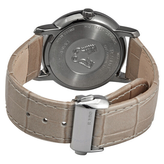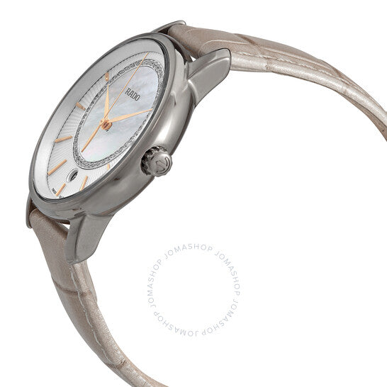 علبة من السيراميك البلازمي (عالي التقنية) مع حزام جلدي بيج. إطار ثابت من السيراميك البلازمي (عالي التقنية). ميناء من عرق اللؤلؤ (مرصع بالألماس) مع عقارب ومؤشرات ساعات من الذهب الوردي. نوع الميناء: تناظري. عرض التاريخ عند موضع الساعة السادسة. حركة كوارتز. زجاج ياقوت مقاوم للخدش. تاج قابل للسحب/الدفع. غطاء خلفي صلب. شكل دائري. حجم العلبة: 33 مم. سمكها: 7.8 مم. مشبك قابل للطي. مقاومة للماء حتى عمق 50 مترًا / 165 قدمًا. الوظائف: التاريخ، الساعة، الدقائق، الثانية. سلسلة دياماست. طراز ساعة رسمية. علامة الساعة: صناعة سويسرية. ساعة رادو دياماست نسائية بمينا من عرق اللؤلؤ، R14064935.