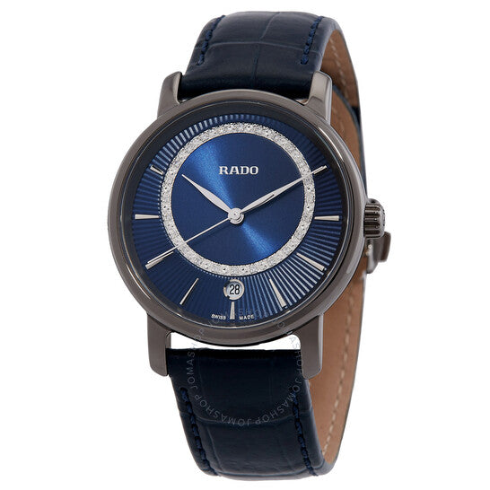 علبة من السيراميك عالي التقنية من البلازما مع حزام جلدي أزرق. إطار ثابت من السيراميك عالي التقنية من البلازما. ميناء أزرق مع عقارب فضية اللون وعلامات ساعات. نوع الميناء: تناظري. عرض التاريخ عند موضع الساعة السادسة. حركة كوارتز. زجاج ياقوت مقاوم للخدش. تاج قابل للسحب/الدفع. غطاء خلفي صلب. شكل دائري، مقاس العلبة: 33 مم، سمكها: 7.8 مم. مشبك تانغ. مقاومة للماء حتى عمق 50 مترًا / 165 قدمًا. الوظائف: التاريخ، الساعة، الدقائق، الثانية. سلسلة دياماست. طراز ساعة رسمية. علامة الساعة: صناعة سويسرية. رقم المنتج: 01.218.0064.3.472. ساعة رادو دياماست كوارتز نسائية بمينا زرقاء، R14064725.