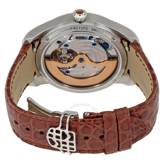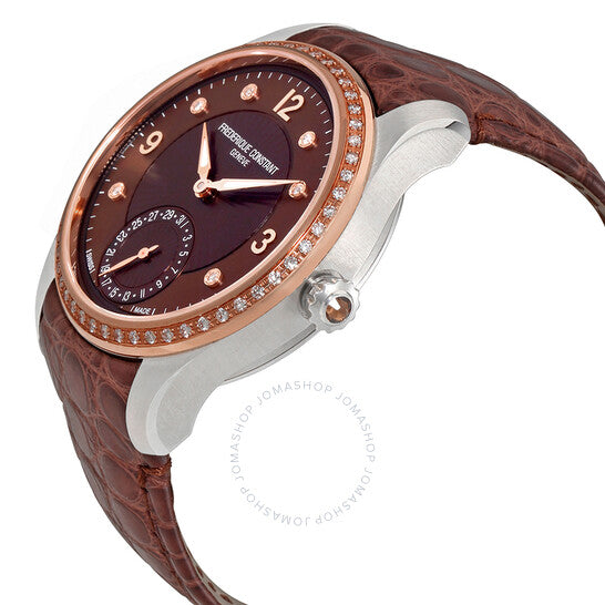 علبة من الفولاذ المقاوم للصدأ فضية اللون مع حزام من الجلد البني. إطار ثابت من الفولاذ المقاوم للصدأ بلون الذهب الوردي. عقارب مضيئة على شكل سهم بلون الذهب الوردي وعلامات ساعات من الماس. أرقام عربية تشير إلى مواضع الساعة 3 و9 و12. علامات الدقائق حول الحافة الخارجية. نوع الميناء: تناظري. عقارب مضيئة. عرض التاريخ عند موضع الساعة 6. ميناء فرعي واحد يعرض: التاريخ. حركة أوتوماتيكية من عيار فريدريك كونستانت FC-700، تحتوي على 26 جوهرة، مكونة من 138 جزءًا، تنبض بسرعة 28800 ذبذبة في الساعة، ولديها احتياطي طاقة لمدة 42 ساعة تقريبًا. كريستال ياقوت مقاوم للخدش. تاج سحب/دفع. غطاء خلفي شفاف. شكل العلبة دائري، حجم العلبة: 39 مم، سمك العلبة: 11 مم. عرض السوار: 20 مم. مشبك تانغ. مقاومة للماء حتى عمق 50 مترًا / 165 قدمًا. الوظائف: التاريخ والساعة والدقيقة. طراز ساعة رسمية. ملصق الساعة: صنع سويسري. ساعة فريدريك كونستانت الماسية الأوتوماتيكية للسيدات FC-700MPCD3MDZ9-BR.