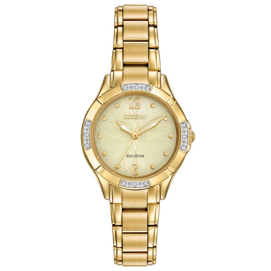 علبة من الفولاذ المقاوم للصدأ بلون ذهبي مع سوار من الفولاذ المقاوم للصدأ بلون ذهبي. إطار ثابت مرصع بالألماس. ميناء ذهبي اللون بنقشة زهور، مع عقارب ذهبية اللون وأرقام منقطة لعلامات الساعات. نوع الميناء: تناظري. عقارب مضيئة. حركة كوارتز إيكو درايف E031. زجاج معدني مقاوم للخدش. تاج قابل للسحب/الدفع. غطاء خلفي صلب. حجم العلبة: 30 مم. شكلها دائري. قابلة للطي بمشبك أمان. مقاومة للماء حتى عمق 30 مترًا / 100 قدم. وظائفها: الساعات، الدقائق، الثواني. تصميم ساعة رسمية. ساعة سيتيزن دايموند نسائية EM0452-58P.