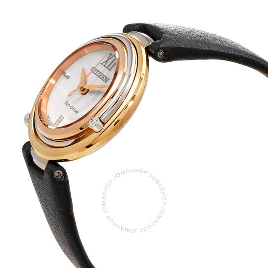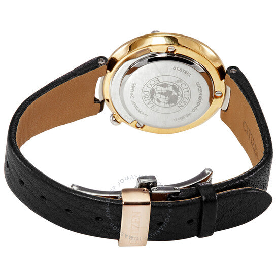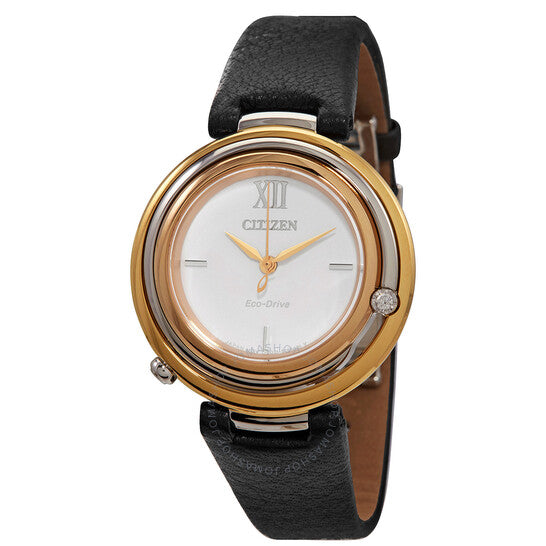علبة من الفولاذ المقاوم للصدأ بلون ذهبي مع سوار جلدي أسود. إطار ذهبي مزدوج ثابت مع حلقة فضية مرصعة بماسة واحدة. ميناء أبيض بعقارب ذهبية اللون. رقم روماني يظهر عند موضع الساعة ١٢. مؤشرات عند مواضع الساعات ٣ و٦ و٩. نوع الميناء: تناظري. حركة سيتيزن كاليبر E031 إيكو-درايف. زجاج ياقوت مقاوم للخدش. تاج قابل للسحب/الدفع. غطاء خلفي صلب. شكل دائري. حجم العلبة: ٣٢.٢ مم. سمكها: ٨ مم. عرض السوار: ١٢ مم. مشبك قابل للطي. مقاومة للماء حتى عمق ٥٠ مترًا / ١٦٥ قدمًا. الوظائف: الساعات، الدقائق، الثواني. تصميم ساعة رسمية. ساعة سيتيزن دايموند نسائية بمينا أبيض وجلد أسود، EM0656-15A.