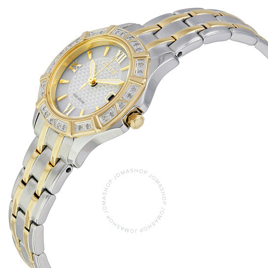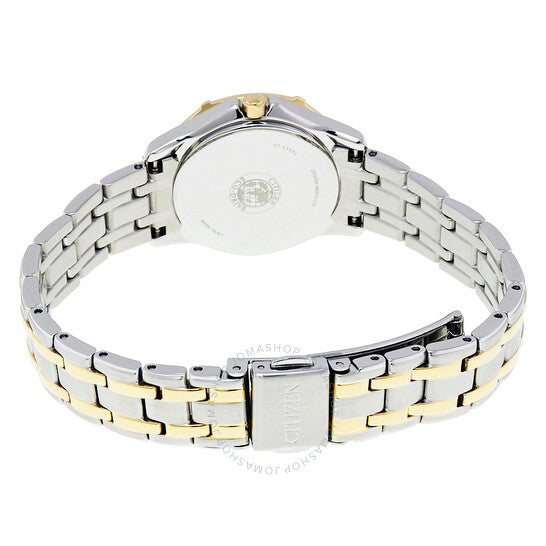 علبة من الفولاذ المقاوم للصدأ بسوار من الفولاذ المقاوم للصدأ ثنائي اللون (فضي وذهبي أصفر). إطار ثابت من الذهب الأصفر مرصع بالألماس. ميناء أبيض بعقارب ومؤشرات ساعات من الذهب الأصفر. أرقام رومانية تُشير إلى الساعات 6 و9 و12. نوع الميناء: تناظري. عقارب مضيئة. نافذة عرض التاريخ عند الساعة 3. آلية حركة سيتيزن كاليبر إيكو-درايف E013 إيكو-درايف. زجاج معدني مقاوم للخدش. تاج قابل للسحب/الدفع. غطاء خلفي صلب. شكل دائري، مقاس العلبة: 26 مم، سمكها: 8.2 مم. عرض السوار: 14 مم. مشبك قابل للطي مع مفتاح أمان. مقاومة للماء حتى عمق 100 متر / 330 قدمًا. الوظائف: التاريخ، الساعة، الدقيقة، الثانية. طراز ساعة رسمية. ملصق الساعة: Japan Movt. ساعة سيتيزن دايموند بيضاء للسيدات EW2364-50A.