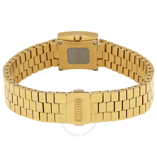 علبة من الفولاذ المقاوم للصدأ بلون الذهب الأصفر مع سوار من الفولاذ المقاوم للصدأ بلون الذهب الأصفر. إطار ثابت من الفولاذ المقاوم للصدأ بلون الذهب الأصفر. ميناء أسود بعقارب ذهبية اللون وعلامات ساعات. نوع الميناء: تناظري. حركة كوارتز. زجاج ياقوتي مقاوم للخدش. تاج قابل للسحب/الدفع. غطاء خلفي صلب. شكل العلبة مربع. حجم العلبة: ٢٠ مم × ٢٠ مم. مقاومة للماء حتى عمق ٣٠ مترًا / ١٠٠ قدم. وظائف الساعة: الساعات، الدقائق. تصميم كاجوال. علامة الساعة: صناعة سويسرية. ساعة رادو دياستار كوارتز نسائية بمينا سوداء R18987153.