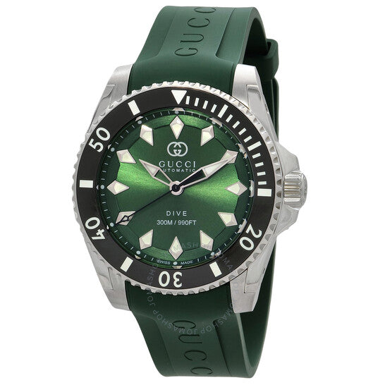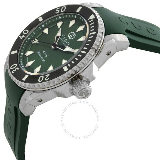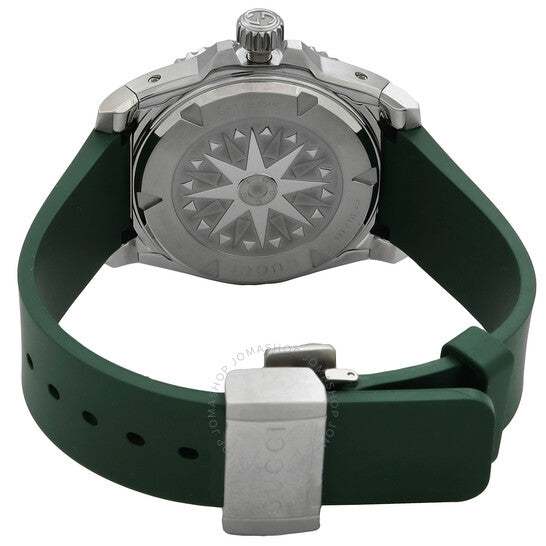 علبة فضية اللون من الفولاذ المقاوم للصدأ مع سوار مطاطي أخضر. إطار دوار أحادي الاتجاه من السيراميك الأسود. ميناء أخضر بعقارب مضيئة ومؤشرات ساعات. مؤشرات دقائق حول الحافة الخارجية. نوع الميناء: تناظري. عقارب ومؤشرات مضيئة. حركة أوتوماتيكية. زجاج ياقوت مقاوم للخدش. تاج لولبي. غطاء خلفي صلب. شكل دائري، مقاس العلبة: 40 مم. مشبك قابل للطي مع مفتاح أمان. مقاومة للماء حتى عمق 300 متر / 1000 قدم. الوظائف: الساعات، الدقائق، الثواني. سلسلة الغوص. طراز ساعة الغوص. علامة الساعة: صناعة سويسرية. ساعة غوتشي دايف أوتوماتيكية للرجال بمينا أخضر YA136360.