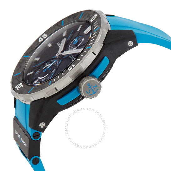 علبة سوداء من الفولاذ المقاوم للصدأ مع سوار مطاطي أزرق. إطار دوار أحادي الاتجاه من الكربون الأسود. ميناء أسود بعقارب ومؤشرات ساعات فضية مضيئة. مؤشرات دقائق حول الحافة الخارجية. نوع الميناء: تناظري. عقارب ومؤشرات مضيئة. عرض التاريخ عند موضع الساعة السادسة. ميناء فرعي واحد يعرض الثواني الصغيرة. حركة أوتوماتيكية. كريستال ياقوت مقاوم للخدش. تاج لولبي. غطاء خلفي شفاف. هيكل دائري الشكل، مقاسه 44 مم. مشبك بإبزيم. مقاومة للماء حتى عمق 300 متر / 1000 قدم. الوظائف: التاريخ، الساعة، الدقيقة، الثانية. سلسلة دايفر. طراز الساعة الرياضية. علامة الساعة: صناعة سويسرية. ساعة أوليس ناردين دايفر أوتوماتيكية للرجال بمينا أسود 1183-170-2B.