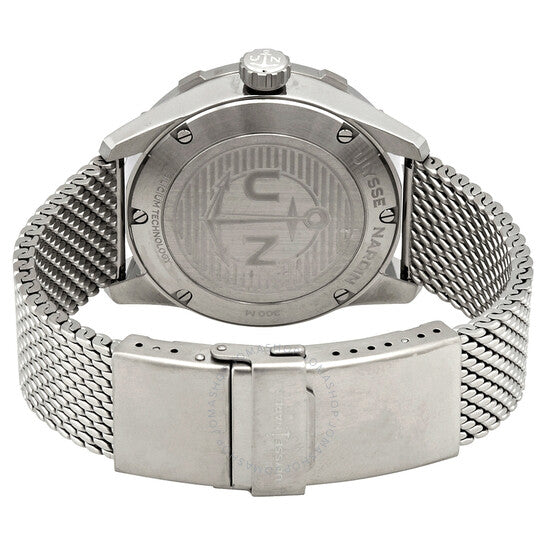 علبة فضية اللون من الفولاذ المقاوم للصدأ مع سوار شبكي ميلانو فضي اللون. إطار أزرق دوار أحادي الاتجاه مقعر مقلوب من الفولاذ المقاوم للصدأ. ميناء أزرق مع عقارب وعلامات ساعات فضية اللون. علامات دقائق حول الحافة الخارجية. نوع الميناء: تناظري. عقارب وعلامات مضيئة. عرض التاريخ عند موضع الساعة السادسة. حركة أوتوماتيكية من أوليس ناردين، عيار UN-816، مع احتياطي طاقة لمدة 42 ساعة. زجاج ياقوت مقاوم للخدش. تاج لولبي. غطاء خلفي صلب. شكل دائري. حجم العلبة: 42 مم. مشبك قابل للطي بزر ضغط. مقاومة للماء حتى عمق 300 متر / 1000 قدم. الوظائف: التاريخ، الساعة، الدقيقة، الثانية. طراز ساعة الغوص. علامة الساعة: صناعة سويسرية. ساعة أوليس ناردين دايفر أوتوماتيكية للرجال، مينا زرقاء، 8163-175-7MIL/93.