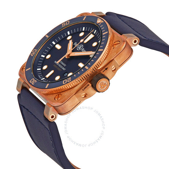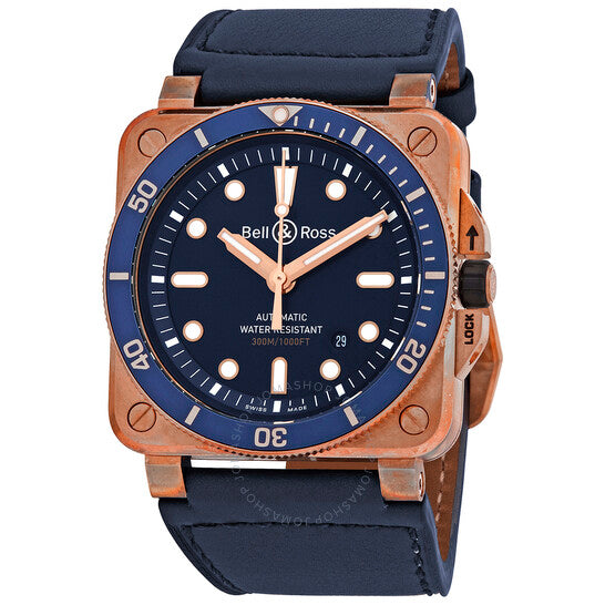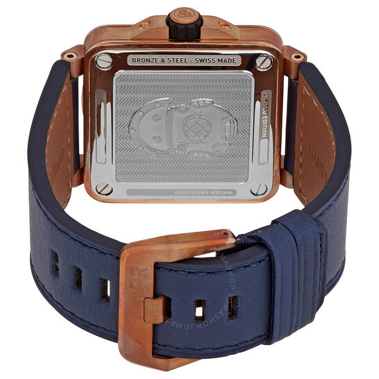 علبة برونزية مع سوار أزرق من جلد العجل. إطار برونزي دوار أحادي الاتجاه مع حشوة من الألومنيوم الأزرق المؤكسد. ميناء أزرق بعقارب مضيئة بلون الذهب الوردي وعلامات ساعات منقطة. علامات دقائق حول الحافة الخارجية. نوع الميناء: تناظري. عقارب وعلامات مضيئة. عرض التاريخ بين موضعي الساعة الرابعة والخامسة. حركة أوتوماتيكية من بيل آند روس، عيار BR-CAL.302، مبنية على سيليتا SW300-1، تحتوي على 25 جوهرة، تنبض بمعدل 28800 ذبذبة في الساعة، ولديها احتياطي طاقة لمدة 38 ساعة تقريبًا. زجاج من الياقوت المقاوم للخدش. تاج لولبي. غطاء خلفي صلب. شكل العلبة مربع، مقاسها: 42 مم. سمكها: 9.8 مم. مشبك تانغ. مقاومة للماء حتى عمق 300 متر / 1000 قدم. الوظائف: التاريخ، الساعة، الدقائق، الثواني. معلومات إضافية: إصدار محدود من 999 قطعة. سوار فيلكرو إضافي من القماش الأسود. سلسلة دايفر. ساعة فاخرة. علامة الساعة: صناعة سويسرية. ساعة بيل آند روس دايفر أوتوماتيكية للرجال بمينا أزرق BR0392-D-LU-BR/SCA.