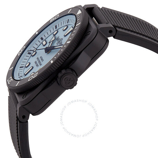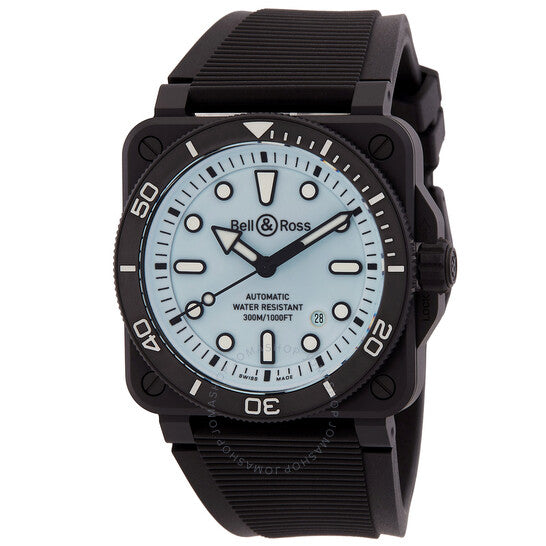 علبة سيراميك سوداء مع سوار مطاطي أسود. إطار سيراميك أسود دوار أحادي الاتجاه. ميناء أزرق بعقارب وعلامات ساعات سوداء. علامات دقائق حول الحافة الخارجية. نوع الميناء: تناظري. عقارب وعلامات مضيئة. عرض التاريخ بين موضعي الساعة الرابعة والخامسة. حركة بيل آند روس أوتوماتيكية، عيار BR-CAL.302، مبنية على سيليتا SW300-1، تحتوي على 25 جوهرة، تنبض بمعدل 28800 ذبذبة في الساعة، ولديها احتياطي طاقة لمدة 38 ساعة تقريبًا. زجاج ياقوت مقاوم للخدش. تاج لولبي. غطاء خلفي صلب. شكل دائري، حجم العلبة: 42 مم. مشبك بإبزيم. مقاومة للماء حتى عمق 300 متر / 1000 قدم. الوظائف: التاريخ، الساعة، الدقيقة، الثانية. سلسلة دايفر. طراز ساعة غوص. ملصق الساعة: صناعة سويسرية. ساعة بيل آند روس دايفر أوتوماتيكية للرجال بمينا أزرق BR03A-D-LM-CE/SRB.