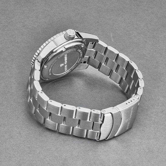 علبة من الفولاذ المقاوم للصدأ مع سوار من الفولاذ المقاوم للصدأ. إطار دوار أحادي الاتجاه من الفولاذ المقاوم للصدأ بحلقة سوداء مرصعة. ميناء أخضر مع عقارب ومؤشرات ساعات فضية مضيئة. مؤشرات دقائق حول الحافة الخارجية. نوع الميناء: تناظري. عقارب ومؤشرات مضيئة. عرض التاريخ عند الساعة 3. آلية حركة أوتوماتيكية. زجاج ياقوت مقاوم للخدش. تاج لولبي. غطاء خلفي صلب. شكل دائري. حجم العلبة: 45 مم. سمكها: 16 مم. عرض السوار: 22 مم. طول السوار: 8 بوصات. مشبك قابل للطي مع مفتاح أمان. مقاومة للماء حتى عمق 300 متر / 1000 قدم. الوظائف: الساعات، الدقائق، الثواني، التاريخ. سلسلة دايفر. تصميم ساعة كاجوال. علامة الساعة: صناعة سويسرية. ساعة ريڤو ثومين دايفر أوتوماتيكية للرجال بمينا أخضر، 17030.2124.