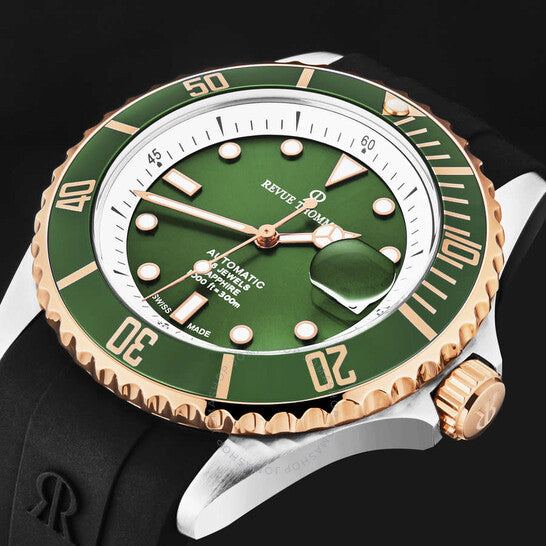 علبة فضية اللون من الفولاذ المقاوم للصدأ مع سوار مطاطي أسود. إطار دوار أحادي الاتجاه من الفولاذ المقاوم للصدأ باللون الأخضر. ميناء أخضر بعقارب ذهبية اللون وعلامات ساعات. علامات دقائق حول الحافة الخارجية. نوع الميناء: تناظري. نافذة عرض التاريخ عند موضع الساعة 3. حركة أوتوماتيكية من طراز Sellita Caliber SW200، تحتوي على 26 جوهرة، تنبض بمعدل 28800 ذبذبة في الساعة، ولديها احتياطي طاقة لمدة 38 ساعة تقريبًا. زجاج من الياقوت المقاوم للخدش. تاج لولبي. غطاء خلفي صلب. شكل دائري، مقاس العلبة: 42 مم، سمكها: 13 مم. عرض السوار: 22 مم، طوله: 8 بوصات. مشبك قابل للطي مع مفتاح أمان. مقاومة للماء حتى عمق 300 متر / 1000 قدم. الوظائف: التاريخ، الساعة، الدقيقة، الثانية. معلومات إضافية: الساعات، الدقائق، الثواني، التاريخ. سلسلة ساعات الغوص. طراز ساعات الغوص. علامة الساعة: صناعة سويسرية. ساعة ريفو ثومين دايفر أوتوماتيكية بمينا أخضر للرجال 17571.2354.