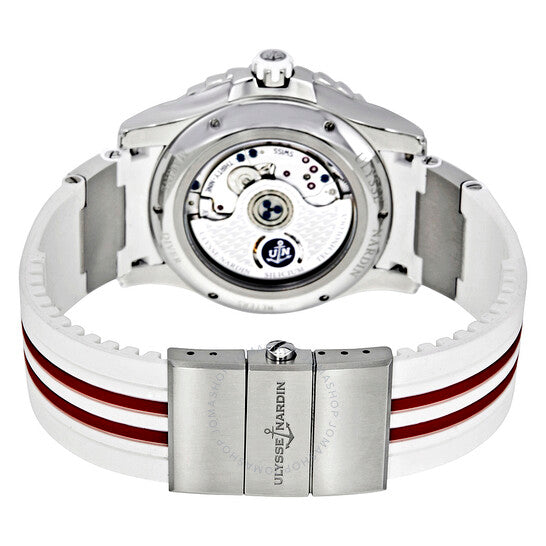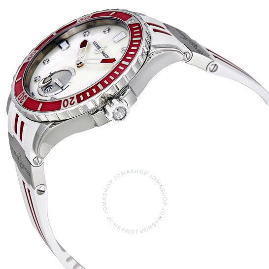 علبة من الفولاذ المقاوم للصدأ مع سوار مطاطي أبيض وأحمر بعناصر من الفولاذ المقاوم للصدأ. إطار دوار أحادي الاتجاه من الفولاذ المقاوم للصدأ مع تطعيم مطاطي أحمر مرصع بماسة واحدة. ميناء من عرق اللؤلؤ مع عقارب فضية مضيئة وعلامات ساعات من الماس. مؤشرات عند الساعة 3 و9 و12. علامات دقائق حول الحافة الخارجية. نوع الميناء: تناظري. عقارب مضيئة. عرض التاريخ عند الساعة 6. ميناء فرعي للثواني فوق الساعة 6. حركة أوتوماتيكية من عيار أوليس ناردين UN-320 مع احتياطي طاقة لمدة 48 ساعة. زجاج ياقوت مقاوم للخدش. تاج لولبي. غطاء خلفي شفاف. حجم العلبة: 40 مم. شكل دائري. مشبك قابل للطي بزر ضغط. مقاومة للماء حتى عمق 300 متر / 1000 قدم. الوظائف: التاريخ، الساعة، الدقائق، الثواني. تصميم ساعة فاخرة. ملصق الساعة: صناعة سويسرية. ساعة Ulysse Nardin Diver للسيدات 3203-190-3R/10.16.