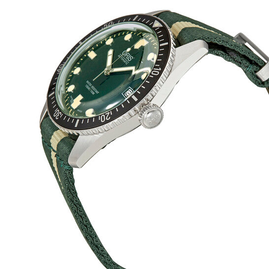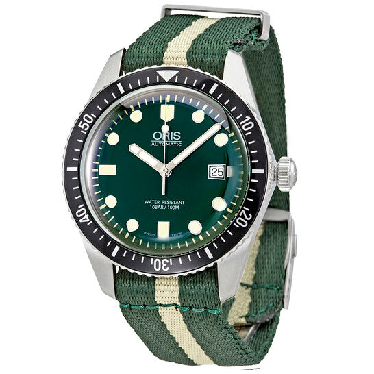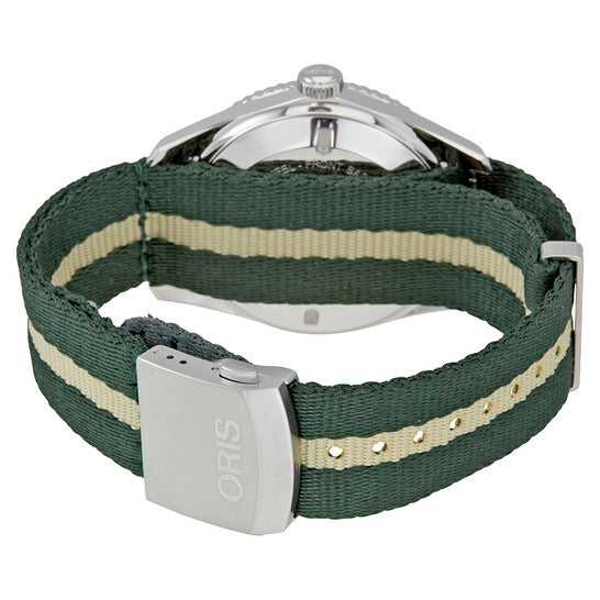 علبة من الفولاذ المقاوم للصدأ فضية اللون مع سوار من نسيج الناتو ثنائي اللون (أخضر وكريمي). حافة دوارة أحادية الاتجاه على شكل عملة معدنية، حلقة علوية سوداء من الفولاذ المقاوم للصدأ من مادة DLC. ميناء أخضر مع عقارب مضيئة فضية اللون وعلامات ساعات منقطة. علامات دقائق حول الحافة الخارجية. نوع الميناء: تناظري. عقارب وعلامات مضيئة. عرض التاريخ عند موضع الساعة 3. حركة أوريس كاليبر 733 أوتوماتيكية، مبنية على سيليتا SW200-1، تحتوي على 26 جوهرة، تنبض بمعدل 28800 ذبذبة في الساعة، ولديها احتياطي طاقة لمدة 38 ساعة تقريبًا. كريستال ياقوت مقاوم للخدش. تاج لولبي. غطاء خلفي صلب. شكل العلبة دائري، حجم العلبة: 42 مم. عرض السوار: 21 مم. مشبك قابل للطي. مقاومة للماء حتى عمق 100 متر / 330 قدمًا. الوظائف: التاريخ، الساعة، الدقيقة، الثانية. سلسلة دايفرز سيكستي فايف. طراز ساعة عسكرية. ملصق الساعة: صناعة سويسرية. ساعة أوريس دايفرز سيكستي فايف أوتوماتيكية للرجال 01 733 7720 4057-07 5 21 24FC.