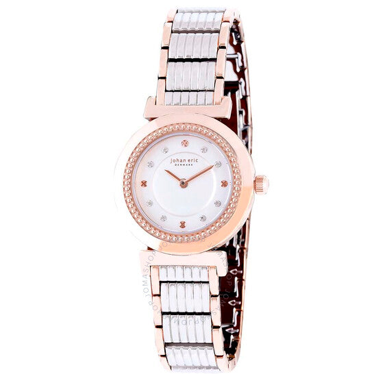 علبة من الفولاذ المقاوم للصدأ بلون الذهب الوردي مع سوار من الفولاذ المقاوم للصدأ بلونين. إطار ثابت من الفولاذ المقاوم للصدأ بلون الذهب الوردي. ميناء أبيض مع عقارب ومؤشرات ساعات بلون الذهب الوردي. نوع الميناء: تناظري. حركة كوارتز. زجاج معدني مقاوم للخدش. تاج ضغط/سحب. غطاء خلفي صلب. شكل دائري، مقاس العلبة: 30 مم، سمكها: 6 مم. عرض السوار: 14 مم، طوله: 7.5 بوصة. مشبك قابل للطي. مقاومة للماء حتى عمق 50 مترًا / 165 قدمًا. الوظائف: الساعات، الدقائق. تصميم كاجوال. ساعة يوهان إريك دجورسلاند النسائية بمينا أبيض JE1200-09-001B.