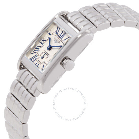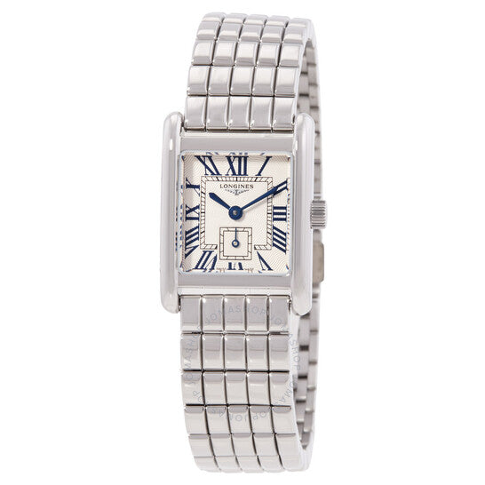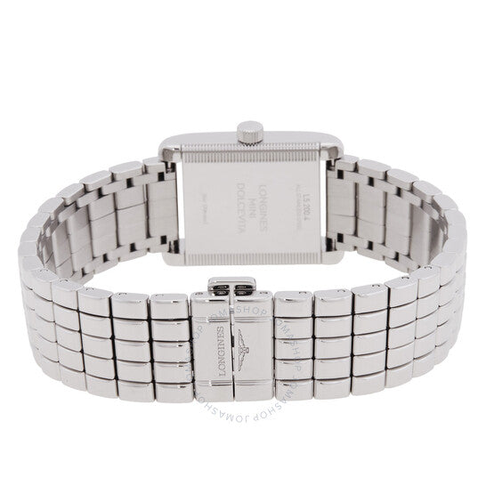 علبة وسوار من الفولاذ المقاوم للصدأ فضي اللون. إطار ثابت من الفولاذ المقاوم للصدأ فضي اللون. ميناء فضي اللون بعقارب زرقاء وعلامات ساعات بأرقام رومانية. مقياس دقائق حول الحافة الداخلية. نوع الميناء: تناظري. ميناء فرعي واحد يعرض الثواني الصغيرة. حركة كوارتز لونجين كاليبر L178. زجاج ياقوتي مقاوم للخدش. غطاء خلفي صلب. هيكل مستطيل الشكل، أبعاده: 21.50 مم × 29.00 مم. مشبك قابل للطي مع مفتاح أمان. مقاومة للماء حتى عمق 30 مترًا / 100 قدم. الوظائف: الساعات، الدقائق، الثواني الصغيرة. معلومات إضافية: العلبة الأصلية، بطاقة الضمان الدولية، دليل الاستخدام (ملحقات كاملة). سلسلة دولتشي فيتا. تصميم ساعة فاخر. ملصق الساعة: صناعة سويسرية. ساعة لونجين دولتشي فيتا كوارتز نسائية بمينا فضي، L5.200.4.71.6.