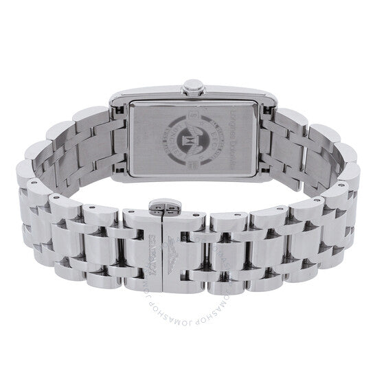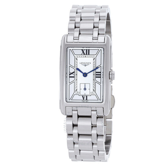 علبة وسوار من الفولاذ المقاوم للصدأ فضي اللون. إطار ثابت من الفولاذ المقاوم للصدأ فضي اللون. ميناء فضي اللون بعقارب زرقاء وعلامات ساعات بأرقام رومانية. مقياس دقائق حول الحافة الداخلية. نوع الميناء: تناظري. ميناء فرعي واحد يعرض الثواني الصغيرة. حركة كوارتز لونجين كاليبر L176. زجاج ياقوتي مقاوم للخدش. غطاء خلفي صلب. شكل العلبة مستطيل، أبعادها: 23.3 × 37 مم. مشبك قابل للطي بزر ضغط. مقاومة للماء حتى عمق 30 مترًا / 100 قدم. الوظائف: الساعات، الدقائق، الثواني الصغيرة. معلومات إضافية: العلبة الأصلية، بطاقة الضمان الدولية، دليل الاستخدام (ملحقات كاملة). سلسلة دولتشي فيتا. تصميم ساعة فاخرة. ملصق الساعة: صناعة سويسرية. ساعة لونجين دولتشي فيتا كوارتز نسائية بمينا فضي، L5.512.4.75.6.