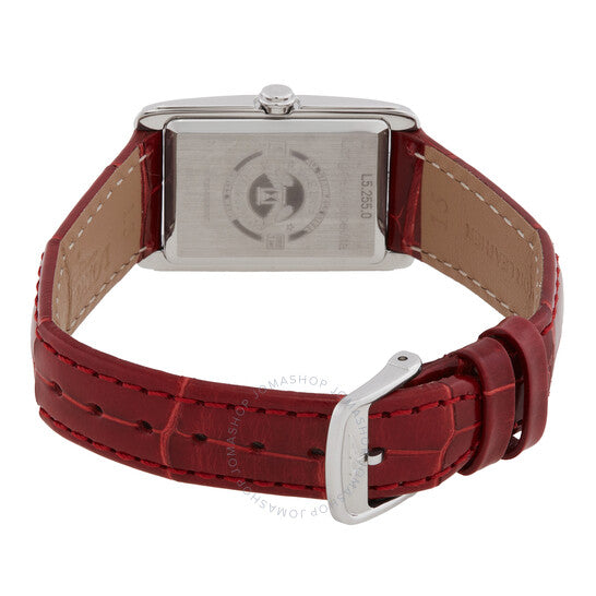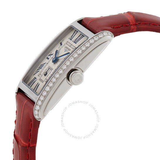 علبة فضية اللون من الفولاذ المقاوم للصدأ مع سوار جلدي أحمر. إطار ثابت مرصع بالألماس. ميناء فضي اللون مع عقارب سوداء وعلامات ساعات بأرقام رومانية. نوع الميناء: تناظري. ميناء فرعي للثواني الصغيرة. حركة كوارتز لونجين كاليبر L178. زجاج من الياقوت المقاوم للخدش. مقاس العلبة: 20.50 مم × 32.00 مم. شكل العلبة مستطيل. مشبك. مقاومة للماء حتى عمق 30 مترًا / 100 قدم. الوظائف: الساعات، الدقائق، الثواني الصغيرة. طراز ساعة رسمية. علامة الساعة: صناعة سويسرية. إصدارات المنتج: L5.255.0.71.5. ساعة لونجين دولتشي فيتا الماسية للسيدات L5.255.0.71.5.