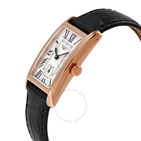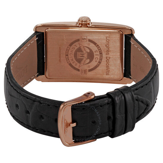 علبة من الذهب الوردي عيار ١٨ قيراطًا مع سوار جلدي أسود. إطار ثابت من الذهب الوردي عيار ١٨ قيراطًا. ميناء فضي بعقارب زرقاء وعلامات ساعات رومانية. علامات دقائق حول حلقة داخلية. نوع الميناء: تناظري. ميناء فرعي للثواني الصغيرة. حركة كوارتز من لونجين عيار L176. زجاج من الياقوت المقاوم للخدش. تاج قابل للسحب/الدفع. غطاء خلفي صلب. شكل العلبة مستطيل. أبعاد العلبة: ٢٣ مم × ٣٧ مم. عرض السوار: ١٧ مم. مشبك تانغ. مقاومة للماء حتى عمق ٣٠ مترًا / ١٠٠ قدم. الوظائف: الساعات، الدقائق، الثواني الصغيرة. سلسلة دولتشي فيتا. طراز ساعة رسمية. علامة الساعة: صناعة سويسرية. ساعة لونجين دولتشي فيتا كوارتز نسائية بمينا فضي، L5.512.8.71.0.