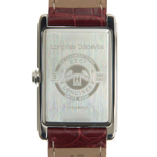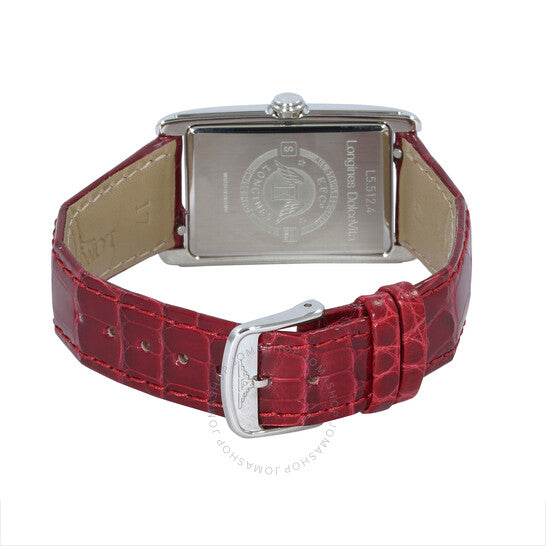 علبة من الفولاذ المقاوم للصدأ مع سوار أحمر من جلد التمساح. إطار ثابت من الفولاذ المقاوم للصدأ. ميناء فضي "فلينك" بعقارب زرقاء وعلامات ساعات رومانية. علامات دقائق حول حلقة داخلية. نوع الميناء: تناظري. ميناء فرعي للثواني الصغيرة. حركة كوارتز لونجين عيار L176. زجاج ياقوت مقاوم للخدش. تاج قابل للسحب/الدفع. غطاء خلفي صلب. شكل مستطيل. أبعاد العلبة: 23.3 مم × 37 مم. سمك العلبة: 7.20 مم. عرض السوار: 17 مم. مشبك تانغ. مقاومة للماء حتى عمق 30 مترًا / 100 قدم. الوظائف: الساعات، الدقائق، الثواني الصغيرة. سلسلة دولتشي فيتا. طراز ساعة رسمية. علامة الساعة: صناعة سويسرية. إصدارات المنتج: L5.512.4.71.5. ساعة لونجين دولتشي فيتا كوارتز نسائية فضية بمينا فلينك، L5.512.4.71.5.