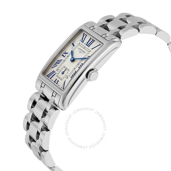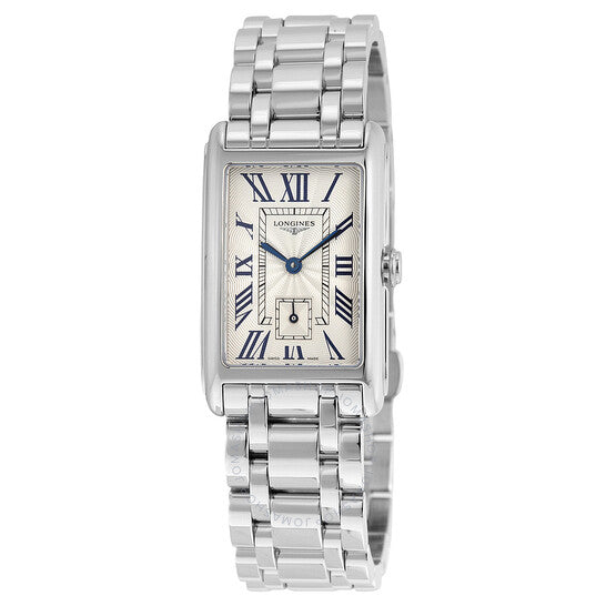 علبة من الفولاذ المقاوم للصدأ مع سوار من الفولاذ المقاوم للصدأ. إطار ثابت من الفولاذ المقاوم للصدأ. ميناء فضي بنقشة فلينك مع عقارب زرقاء على طراز بريجيه وعلامات ساعات رومانية سوداء. علامات دقائق حول حلقة داخلية. نوع الميناء: تناظري. ميناء فرعي للثواني الصغيرة. حركة كوارتز من لونجين عيار L176. زجاج من الياقوت المقاوم للخدش. تاج قابل للسحب/الدفع. غطاء خلفي صلب. شكل مستطيل. أبعاد العلبة: 23 مم × 37 مم. سمك العلبة: 6.65 مم. عرض السوار: 17 مم. مشبك قابل للطي بزر ضغط. مقاومة للماء حتى عمق 30 مترًا / 100 قدم. الوظائف: الساعات، الدقائق، الثواني الصغيرة. سلسلة دولتشي فيتا. طراز ساعة رسمية. علامة الساعة: صناعة سويسرية. ساعة لونجين دولتشي فيتا النسائية بمينا فضي بنقشة فلينك، L5.512.4.71.6.