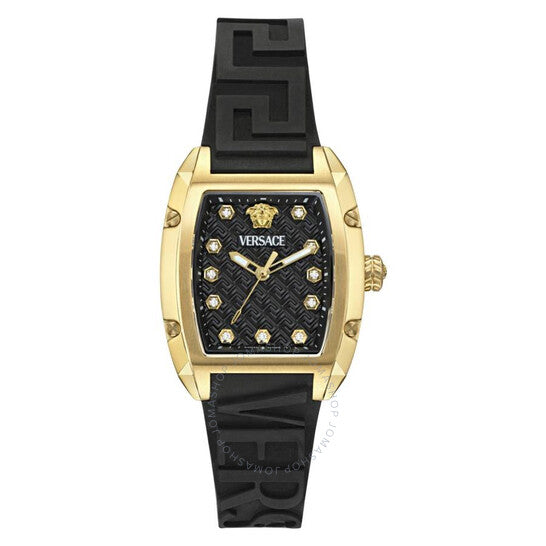 علبة من الفولاذ المقاوم للصدأ بلون ذهبي مع حزام سيليكون أسود. إطار ثابت من الفولاذ المقاوم للصدأ بلون ذهبي. ميناء أسود بعقارب ذهبية اللون وعلامات ساعات من الألماس. نوع الميناء: تناظري. عقارب وعلامات مضيئة. حركة كوارتز. زجاج ياقوت مقاوم للخدش. غطاء خلفي صلب. شكل العلبة: برميل، مقاسها: 36 مم. مشبك بإبزيم. مقاومة للماء حتى عمق 50 مترًا / 165 قدمًا. الوظائف: الساعات، الدقائق، الثواني. سلسلة دومينوس. طراز ساعة رسمية. علامة الساعة: صناعة سويسرية. ساعة فيرساتشي دومينوس كوارتز نسائية بمينا سوداء مرصعة بالألماس VE8K00324.
