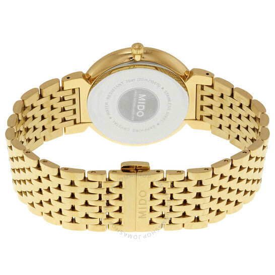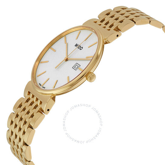 علبة وسوار من الفولاذ المقاوم للصدأ مطليان بالذهب الأصفر بتقنية PVD. إطار ثابت مطلي بالذهب الأصفر بتقنية PVD. ميناء أبيض بعقارب ومؤشرات ساعات ذهبية اللون. نوع الميناء: تناظري. عرض التاريخ عند موضع الساعة 3. حركة كوارتز عيار ETA 955.412. زجاج ياقوت مقاوم للخدش. تاج قابل للسحب/الدفع. غطاء خلفي صلب. شكل دائري. حجم العلبة: 38 مم. سمكها: 5.80 مم. عرض السوار: 14 مم. مشبك قابل للطي. مقاومة للماء حتى عمق 30 مترًا / 100 قدم. الوظائف: التاريخ، الساعات، الدقائق، الثواني، مؤشر عمر البطارية. طراز ساعة رسمية. علامة الساعة: صناعة سويسرية. ساعة ميدو دورادا للرجال بمينا أبيض M009.610.33.011.00.