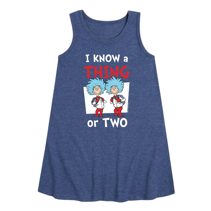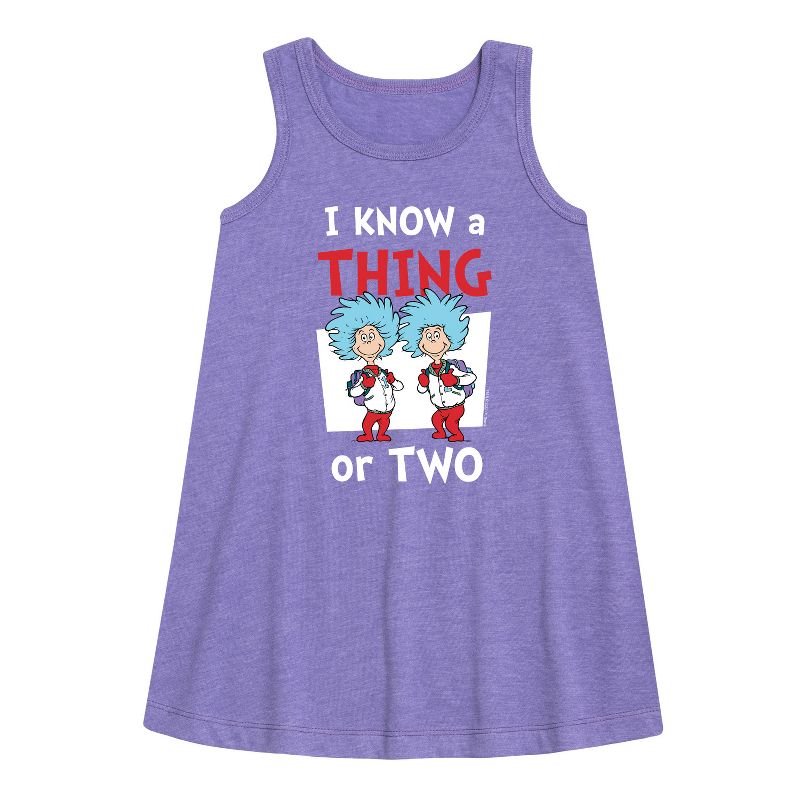 فستان بقصة حرف A من دكتور سوس - أعرف شيئًا أو اثنين - للفتيات الصغيرات والشابات - مجموعتنا من الملابس الجرافيكية التي تحمل شخصيات دكتور سوس المرخصة رسميًا تُضفي لمسةً من غموض وسحر سوسفيل على خزانة ملابسكِ. من القطة ذات القبعة المشاغبة إلى غرينش ذي الرائحة الكريهة، يُبرز كل تصميم شخصيات ومشاهد شهيرة من قصص دكتور سوس الخالدة.