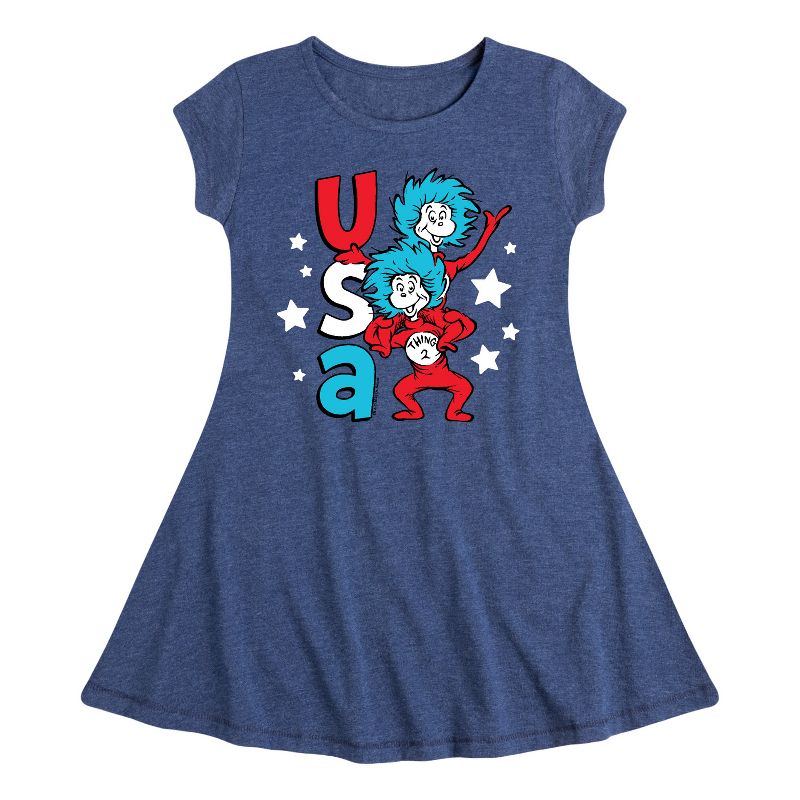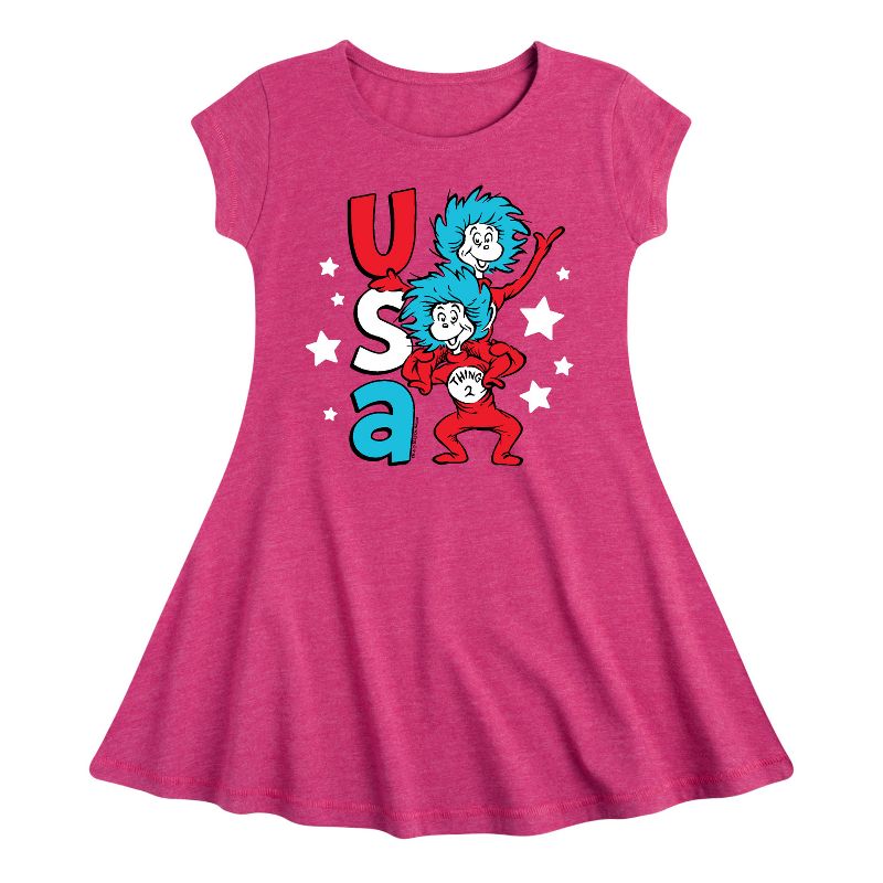 دكتور سوس - يو إس إيه ثينجز - فستان ضيق وواسع للفتيات الصغيرات والشابات - مجموعتنا من الملابس الرسومية التي تحمل شخصيات دكتور سوس المرخصة رسميًا تُضفي لمسةً من غموض وروعة سوسفيل على خزانة ملابسكِ. من القطة ذات القبعة المشاغبة إلى غرينش ذي الرائحة الكريهة، يُبرز كل تصميم شخصيات ومشاهد شهيرة من قصص دكتور سوس الخالدة.