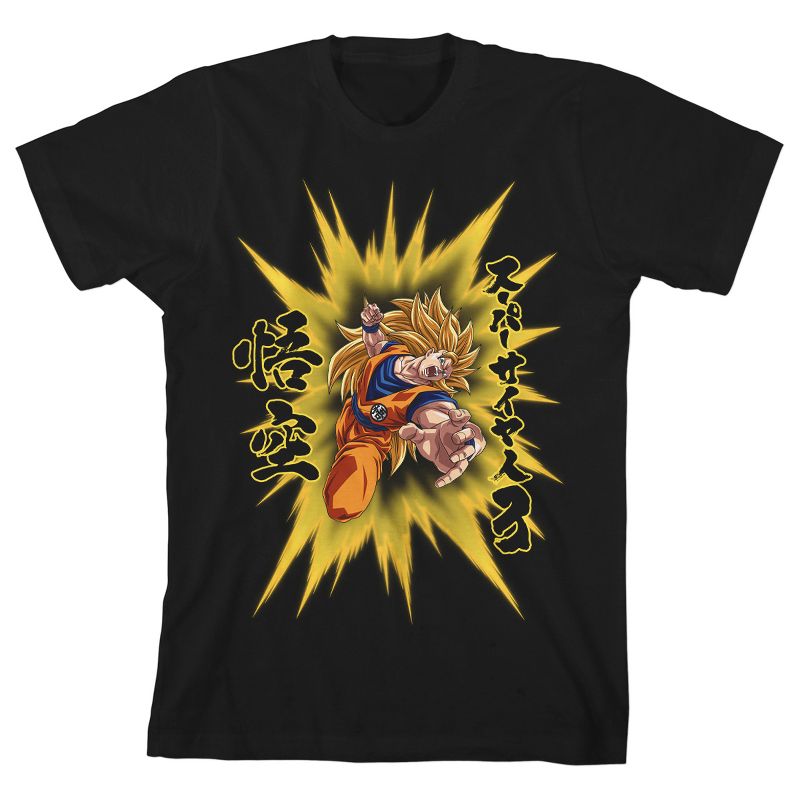 - تيشيرت برسومات: يتحول غوكو إلى سوبر سايان ويهاجم هذا التيشيرت المرسوم وهو يتوهج بطاقة صفراء. تظهر بجانبه أحرف كانجي سوداء وأحرف صفراء. سيحب عشاق بطل الأنمي هذا التيشيرت المرح.