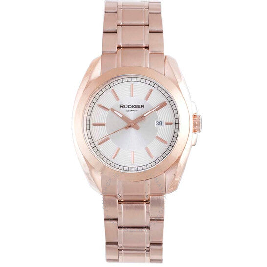 علبة من الفولاذ المقاوم للصدأ بلون الذهب الوردي مع سوار من الفولاذ المقاوم للصدأ بلون الذهب الوردي. إطار ثابت من الفولاذ المقاوم للصدأ بلون الذهب الوردي. ميناء فضي مع عقارب وعلامات ساعات ذهبية وردية اللون. علامات دقائق حول الحافة الخارجية. نوع الميناء: تناظري. عرض التاريخ عند موضع الساعة 3. حركة كوارتز. زجاج معدني مقاوم للخدش. تاج ضغط/سحب. غطاء خلفي صلب. شكل دائري، مقاس العلبة: 41 مم، سمكها: 12 مم. عرض السوار: 21 مم، طوله: 8.5 بوصة. مشبك قابل للطي. مقاومة للماء حتى عمق 50 مترًا / 165 قدمًا. الوظائف: التاريخ، الساعة، الدقائق، الثواني. تصميم كاجوال. ساعة روديجر دريسدن للرجال بمينا فضي R1001-09-001.