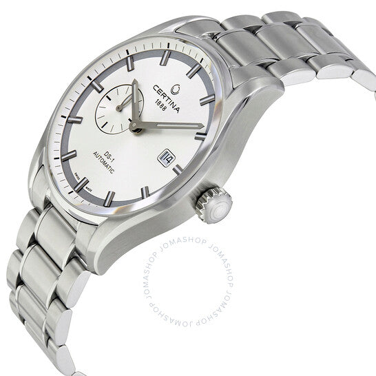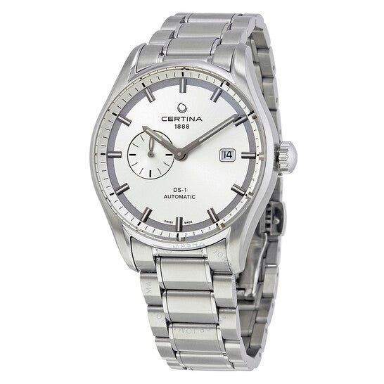 علبة من الفولاذ المقاوم للصدأ مع سوار من الفولاذ المقاوم للصدأ. إطار ثابت من الفولاذ المقاوم للصدأ. ميناء فضي مع عقارب رمادية مضيئة وعلامات ساعات. علامات دقائق حول الحافة الخارجية. نوع الميناء: تناظري. عقارب وعلامات مضيئة. عرض التاريخ عند موضع الساعة 3. ميناء فرعي للثواني الصغيرة. حركة أوتوماتيكية من عيار ETA 2825-2، مبنية على ETA 2824-2، تحتوي على 25 جوهرة، تنبض بمعدل 28800 ذبذبة في الساعة، ولديها احتياطي طاقة لمدة 42 ساعة تقريبًا. زجاج ياقوت مقاوم للخدش. تاج قابل للسحب/الدفع. غطاء خلفي شفاف. شكل دائري. حجم العلبة: 41 مم. سمك العلبة: 14.66 مم. عرض السوار: 21 مم. مشبك قابل للطي بزر ضغط. مقاومة للماء حتى عمق 100 متر / 330 قدمًا. الوظائف: التاريخ، الساعة، الدقائق، الثواني. طراز ساعة رسمية. ملصق الساعة: صناعة سويسرية. ساعة سيرتينا DS-1 أوتوماتيكية للرجال بمينا فضي C006.428.11.031.00.