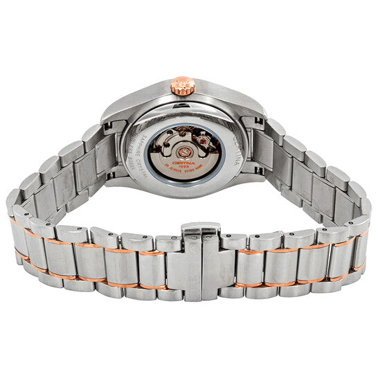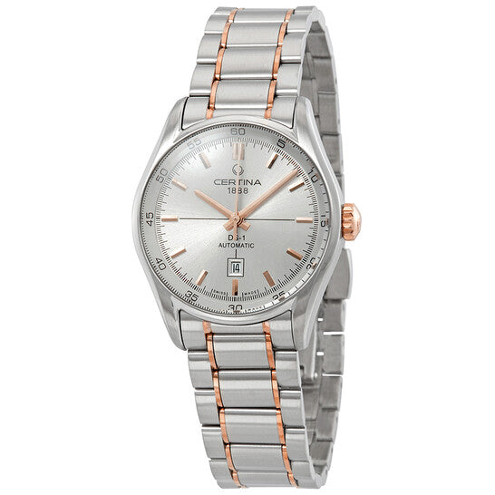 علبة من الفولاذ المقاوم للصدأ مع سوار من الفولاذ المقاوم للصدأ ثنائي اللون (فضي وذهبي وردي مطلي بتقنية الترسيب الفيزيائي للبخار). إطار ثابت من الفولاذ المقاوم للصدأ. ميناء فضي مع عقارب وعلامات ساعات ذهبية وردية اللون. علامات دقائق. علامات دقائق بأرقام عربية (بفاصل ٥ دقائق) حول الحافة الخارجية. نوع الميناء: تناظري. عرض التاريخ أعلى موضع الساعة السادسة. حركة أوتوماتيكية من عيار ETA ٢٦٧١ مع احتياطي طاقة لمدة ٣٨ ساعة. زجاج من الياقوت المقاوم للخدش. تاج قابل للسحب/الدفع. غطاء خلفي شفاف. شكل دائري. حجم العلبة: ٣٠ مم. سمك العلبة: ١١ مم. عرض السوار: ١٥ مم. طول السوار: ٧ بوصات. مشبك فراشة بزر ضغط. مقاومة للماء حتى عمق ١٠٠ متر / ٣٣٠ قدمًا. الوظائف: التاريخ، الساعة، الدقيقة، الثانية. طراز ساعة رسمية. علامة الساعة: صناعة سويسرية. ساعة سيرتينا DS-1 النسائية الأوتوماتيكية C006.207.22.031.00.